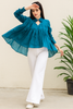 Brave the evening with temptress beauty and grace wearing asymmetric side cowl set. This asymmetric side cowl set has a ruffled fold over detail and side cowl drape which is detachable. this set can be worn with or without side cowl creating two very different looks. The form fitting bodice gives way to a majestic straight pants with side saree like cowl. The dress made in pure tussar silk soft material, it doesn’t stretch which helps keep its stunning shape. Enhance your visual appeal in this luxurious set with heels and long earrings.